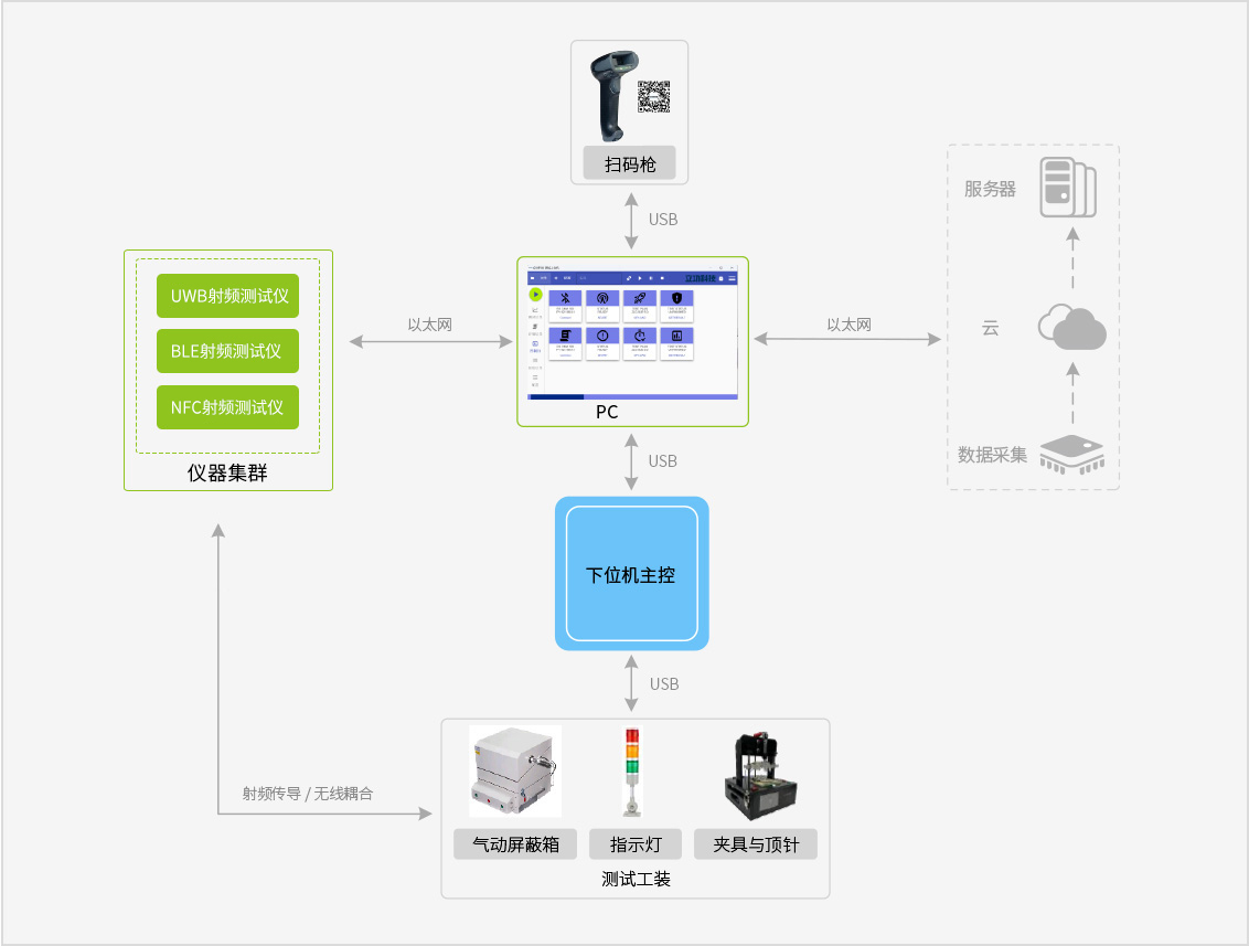 本方案针对嵌入式无线射频产品(UWB、BLE、NFC)的量产测试进行设计,主要功能是对产品的无线射频性能进行全方位测试,并集成其他功能性测试,基于多年产品生产、测试经验,全面保证测试高效、产品可靠,同时降低复用成本。